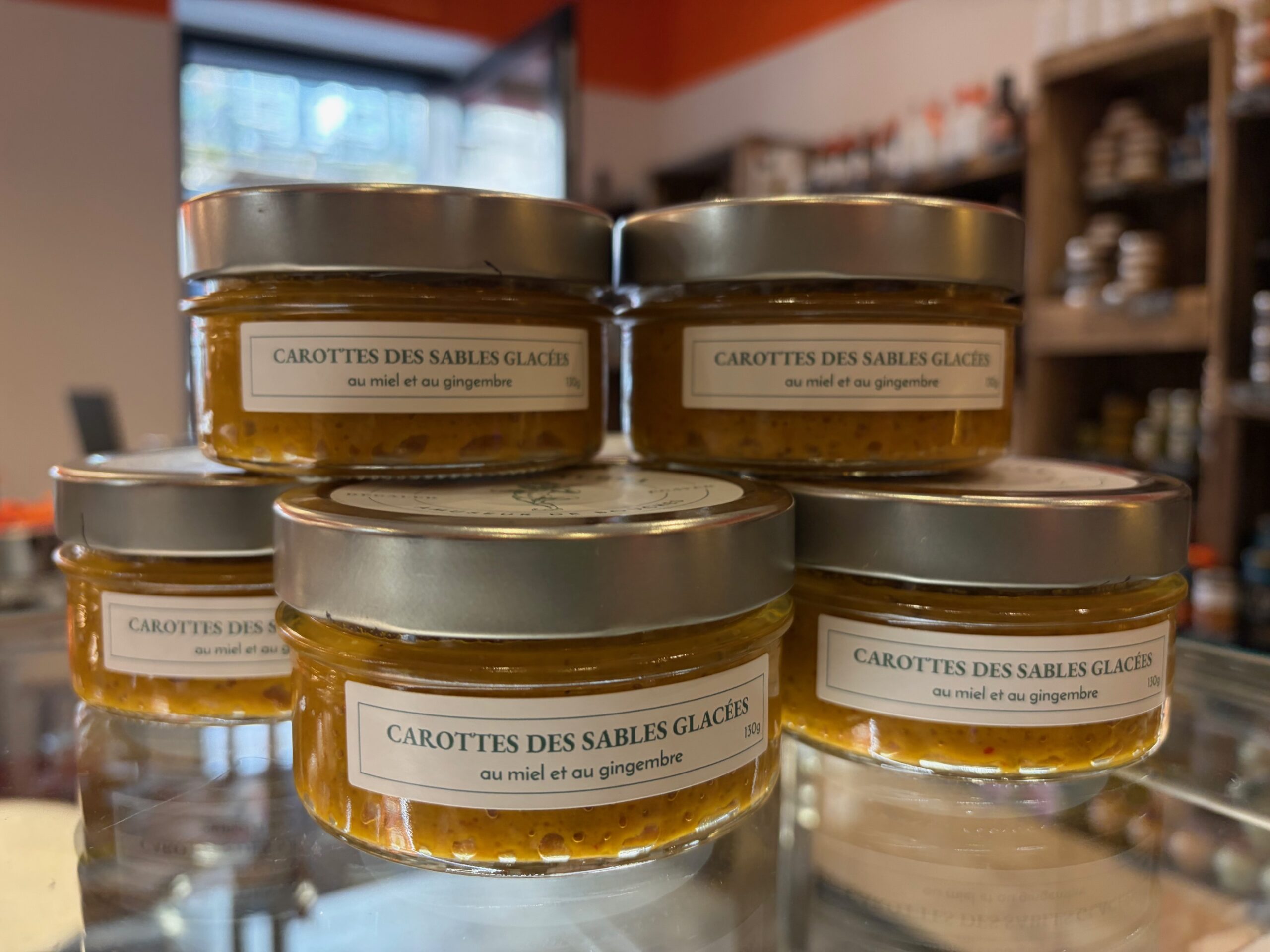 Ingrédients : Carottes glacées 79% (carottes des Landes, huile de tournesol des Landes, miel du Sud Gironde 6%, gingembre 4%, romarin), huile de tournesol des Landes, eau, jus de citrons, Asperges cultivées dans les Landes (73%), huile de tournesol des Landes, jus de citrons, noix du Périgord, sel de l’Ile de Ré, épices.